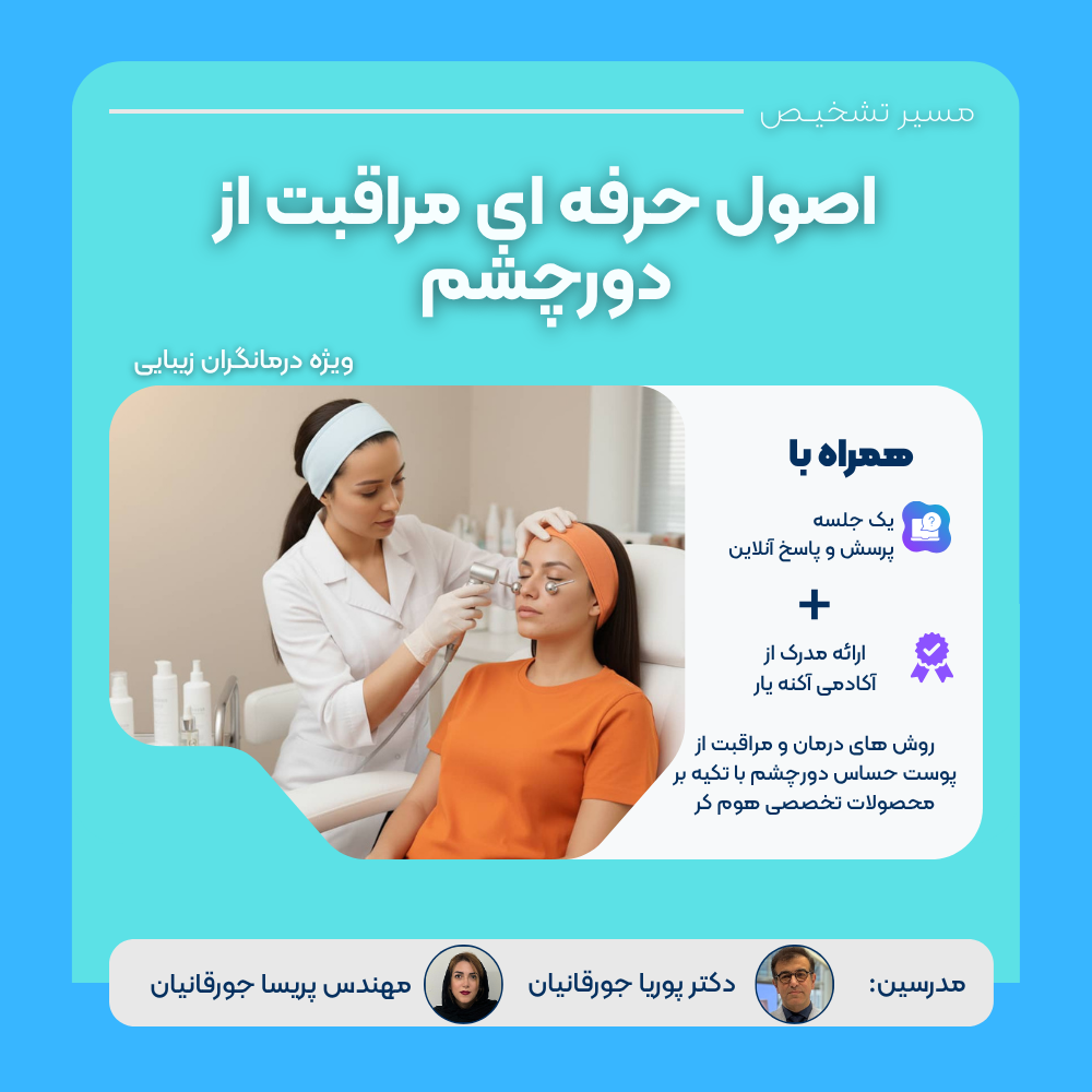 وبینار دور چشم حرفهای یک جلسه آموزشی آنلاین است که به بررسی تخصصی مراقبت از ناحیه دور چشم میپردازد. در این وبینار، نکاتی درباره روشهای پیشگیری از چروک و پف، و معرفی محصولات یا تکنیکهای درمانی مؤثر ارائه میشود.